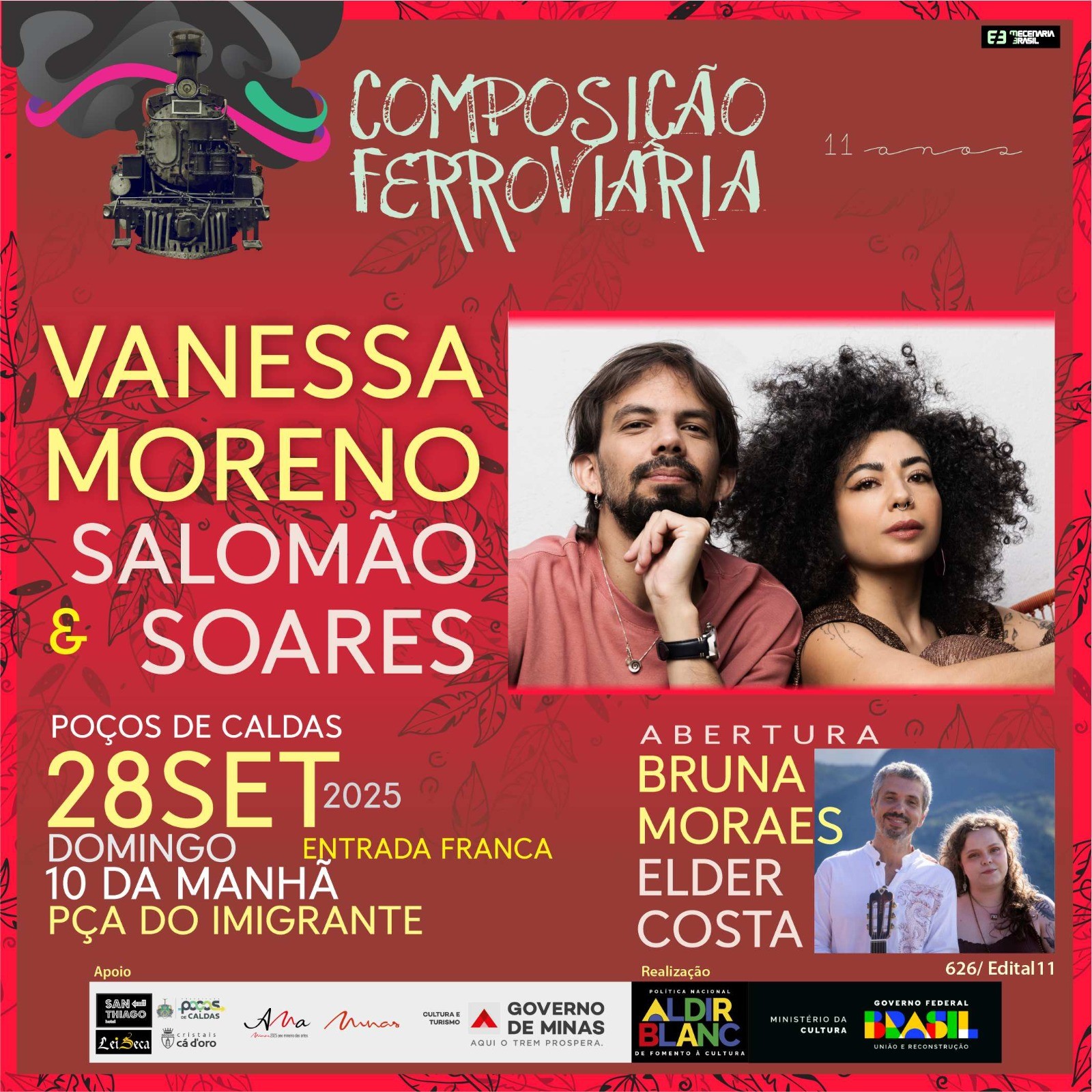 O projeto Composição Ferroviária é realizado pela Mecenaria Brasil, com apoio da PNAB – Política Nacional Aldir Blanc de Fomento à Cultura. Apoio: Secretarias de Cultura e Turismo de Poços de Caldas, Restaurante Lei Seca e Hotel San Thiago.